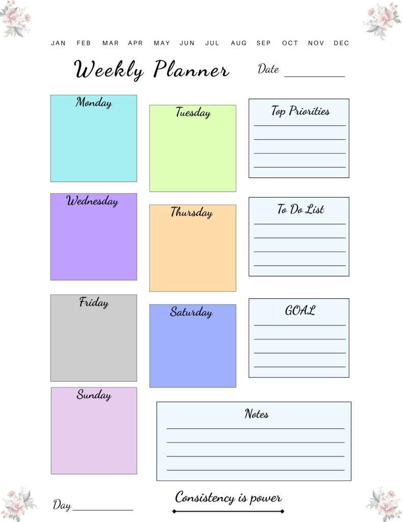 • The Weekly Planner: Perfect for organizing your weekly workflow. It uses color-coded daily blocks, a To-Do List, and a Weekly Goal section to ensure you stay productive from Monday to Sunday.